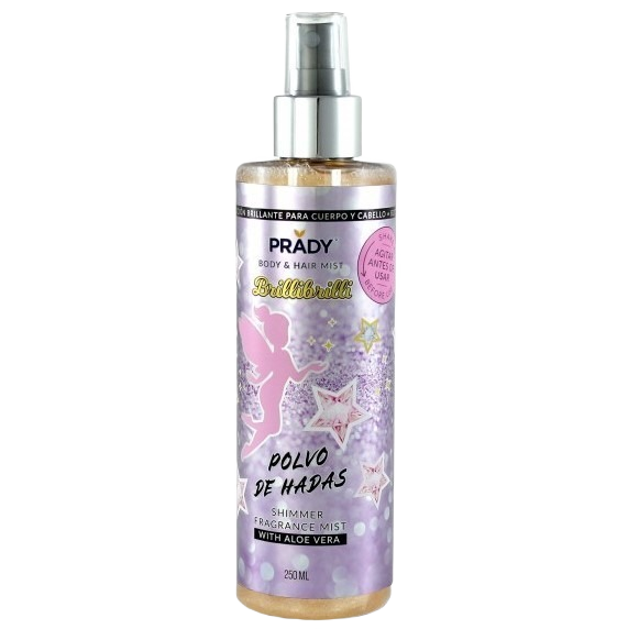 Bruma tanto para la piel como para el pelo de la marca prady, ideal para hidratarse y darle un toque brilli brilli a tu piel, con un aroma delicioso a polvo de hadas