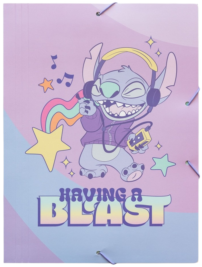 Preciosa y divertida carpeta de Stitch. Cuenta con solapas de cartón flexible y goma de cierre.