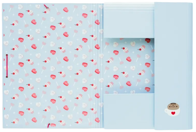 Esta carpeta escolar de Pusheen está elaborada en tapa dura de cartón de 2 mm de grosor forrada con papel mate de 150 g/m2. Respecto a su tamaño, mide 34 centímetros de alto por 25,5 de ancho.
